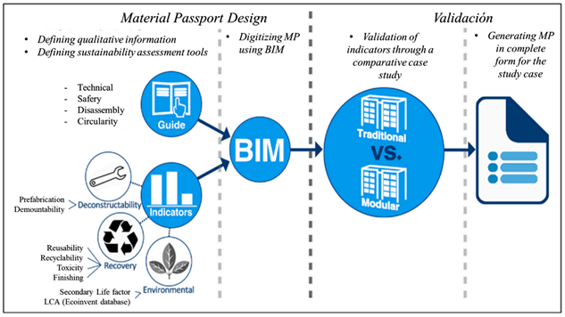 On the other hand, Building Information Modeling (BIM) and 3D printing are important components of digitalization. The former is a methodology that allows creating three-dimensional digital models of buildings, infrastructure, and construction projects, containing detailed information about construction elements such as design parameters, concrete type, structure dimensions and location in the building, installation characteristics, etc. (Sudarsan et al., 2023). Thus, BIM enables the optimization of project planning, design, and management, which is affected by variables associated with the use of cement and concrete in supply logistics, simulation and structural analysis, construction procedures, etc. This allows for better decision-making that reduces errors during construction (Atta et al., 2021). Highlight that BIM facilitates communication and collaboration among project stakeholders by providing real-time access and updates to model information (Atta et al., 2021; Sudarsan et al., 2023), optimizing the use of cement and concrete, waste, and construction times. I. Atta et al. (2021) proposed a sustainable design method based on the Material Passport (MP) tool (Figure 3), which require input parameters such as sustainability assessment tools, technical material details, and the establishment of indicators to determine the final disposition. With these data, the MP is designed and digitized using BIM and the information is then processed to validate the manufacturing characteristics and the specific case study where the material will used.