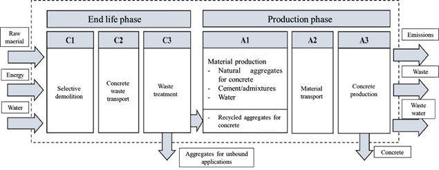| Figure 4. Life Cycle Assessment Model for recycled concrete (Mostert et al., 2021). | ||||