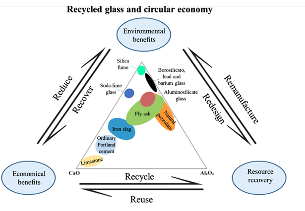 It is worth mentioning that the utilization of recycled aggregates requires a proper process of selection, classification, and processing to ensure their quality, meeting the requirements of strength, durability, and other properties of interest for concrete (Al-Sinan et al., 2022; Althoey et al., 2022; Díaz-Aguilera et al., 2021). An example of implementation of the CE and recycled glass aggregates was published by M. Nodehi et al. (2022). Figure 5 is a triangular model that relates environmental benefits with economics ones and resources recovery base on the concept of the 6Rs: remanufacture, redesign, recycle, reuse, recover, and reduce waste.