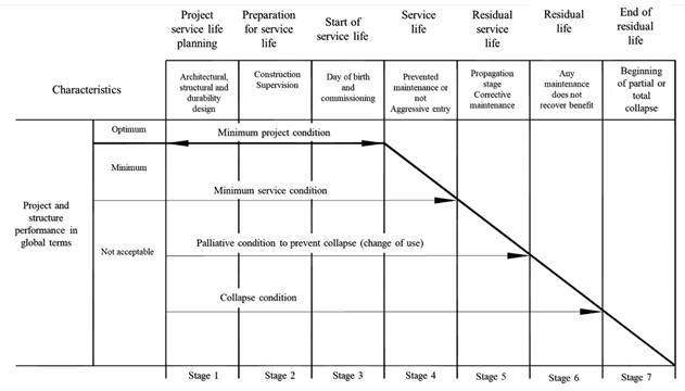 However, to consolidate these approaches, schematics service life models are required to guide the stage at which the concrete structure is located and the actions that can be taken to extend its durability. In this regard, an example is shown in Figure 6 (Castro y Helene, 2007), in which service life is divided into 7 stages. This model is presented under a comprehensive philosophy, which divides the life cycle into stages that align with project planning, as well as with the application of the CE according to the specific needs of each stage. For example, to achieve optimal performance, the first three stages, including planning, preparation, and the day of putting into service, are analyzed. The minimum service condition is maintained only during the fourth stage, where preventive maintenance against the ingress of aggressive substances is required (approach ii to extend the life cycle). In general, stages five, six, and seven are where the structure no longer exhibits acceptable performance. These states include residual service life, remaining life, and end of remaining life, in which the approach iii of structural repair and reinforcement described earlier would be analyzed.