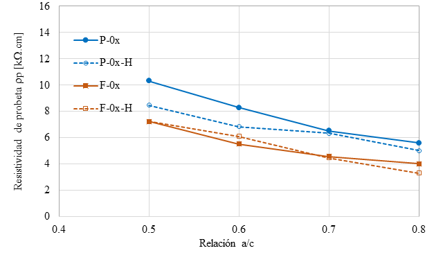 El hecho de lograr bajas relaciones a/c en el diseño de un hormigón, permitiría conseguir una matriz cementicia menos permeable a la solución de poros y en consecuencia, a una mayor dificultad al desplazamiento de los electrones en la microestructura del hormigón. Esta situación se observó en los valores de resistividad obtenidos, donde esta aumentó cuando la relación a/c disminuyó. Por su parte, Van Noort et al. (2016) quienes evaluaron entre otros efectos en la resistividad el de la relación a/c, observaron que el contenido efectivo de agua de una mezcla de concreto fresco controla la resistividad del concreto endurecido, por lo tanto una disminución de la relación a/c a contenido de cemento constante dará como resultado un aumento en la resistividad.