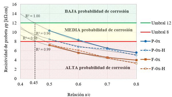 Al respecto y con los resultados experimentales obtenidos en cada pastonada y graficados, se procedió a una extrapolación hacia atrás (Figura 5), representándose al mismo tiempo, los umbrales antes mencionados. A partir de lo graficado se pudo inferir para lo que resultó ser la pastonada de mejor desempeño (P-0x), cual resultaría ser el límite máximo para la relación a/c por debajo del cual se podrían lograr hormigones con resistividades eléctricas conducentes a una baja probabilidad de ocurrencia del fenómeno de corrosión. Este límite máximo inferido para la relación a/c y para la pastonada indicada, resultó ser de aproximadamente 0.45. El resto de las pastonadas y para relaciones a/c inferidas entre 0.4 y 0.45 a partir de la extrapolación indicada, presentarían niveles de resistividad eléctrica conducentes a una probabilidad media de ocurrencia del fenómeno de corrosión.