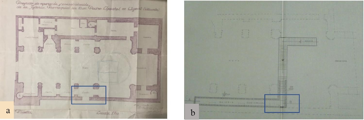 Figure 3. a) General drawing of the church made for the intervention carried out in the 1960s by Antonio Serrano Peral. b) Detail of the staircase and excavated area inside the church. The location of the doorway under study is indicated. Source: private archive of the Serrano Peral family.