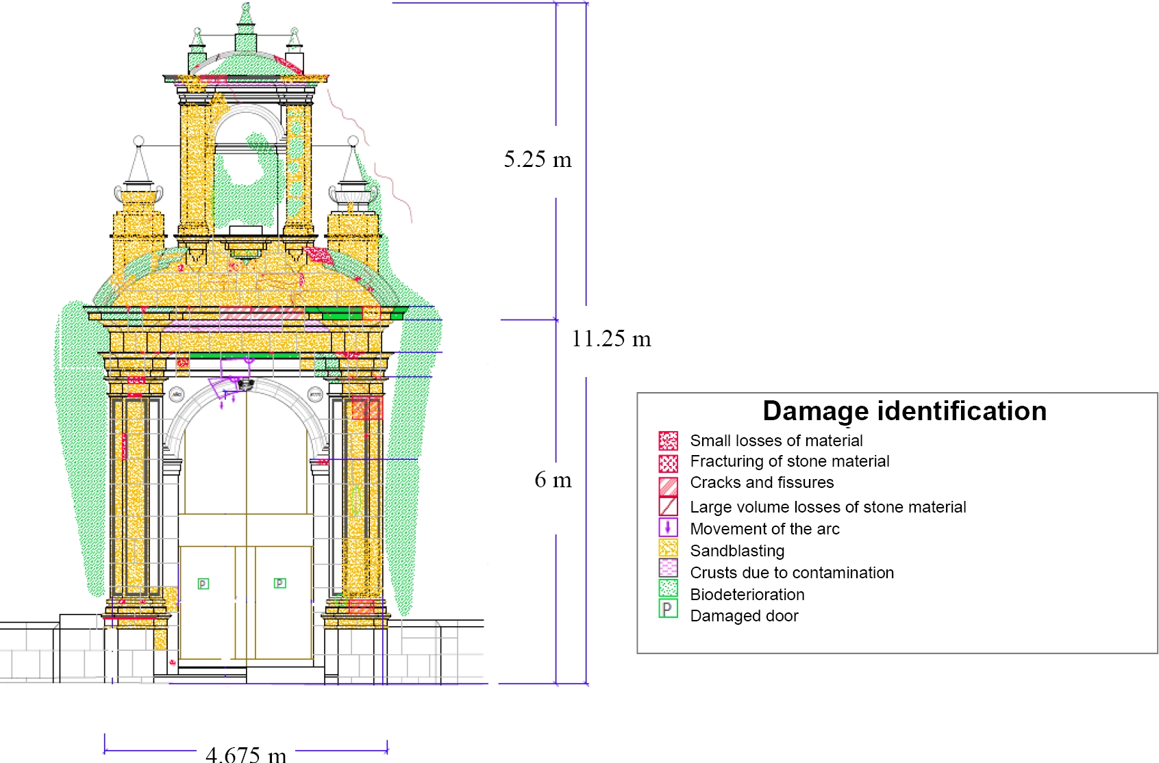 The diagnosis of the state of conservation of the materials that make up the facade was based on the ICOMOS-ISCS glossary (2008) and an assessment was made of the degree of deterioration and its danger by the multidisciplinary team that carried out the restoration project.
