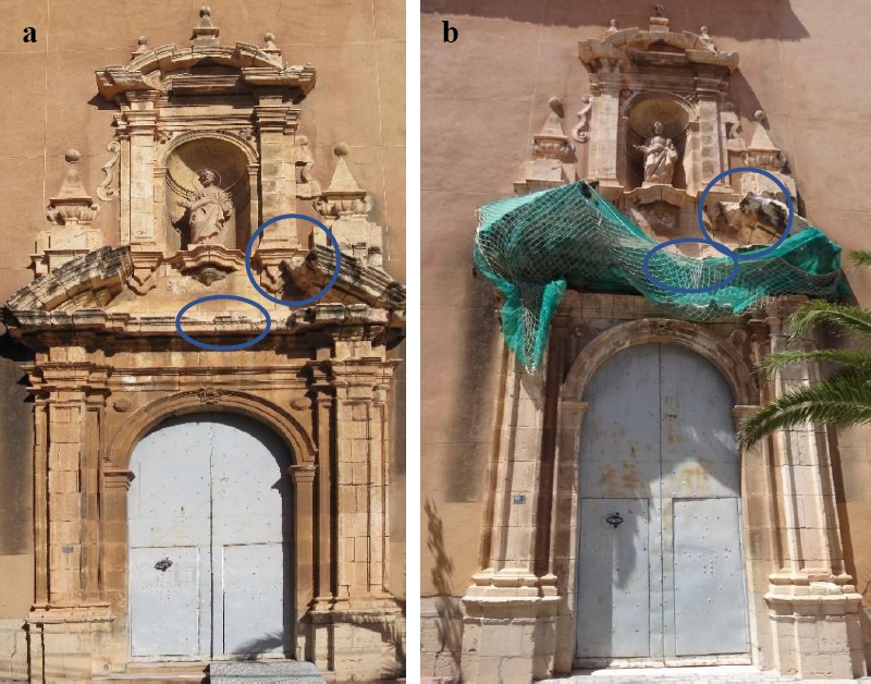 During the Spanish Civil War (1936-39) the building suffered considerable damage and even suffered a fire. The existing images on both facades were destroyed, particularly the image of Saint Peter on this facade (Figure 2a). After a major intervention of the building in the 1960s, there have been no further major structural interventions affecting this facade (Figure 2b). In 2014, some detachments were detected in elements of this facade and a protective net had to be installed, which had to be replaced again in 2021 due to detachments of stone elements (Figure 2c). In 2023, the restoration process began following a study and a project carried out at the University of Alicante.