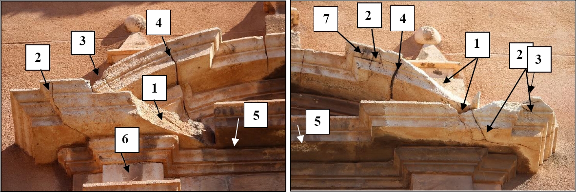 The fact that the grouting material is gypsum has meant that it is easily altered when in contact with rainwater and capillary rise, and once this joint is lost, the water can be retained, favouring the gradual degradation of the limestone.