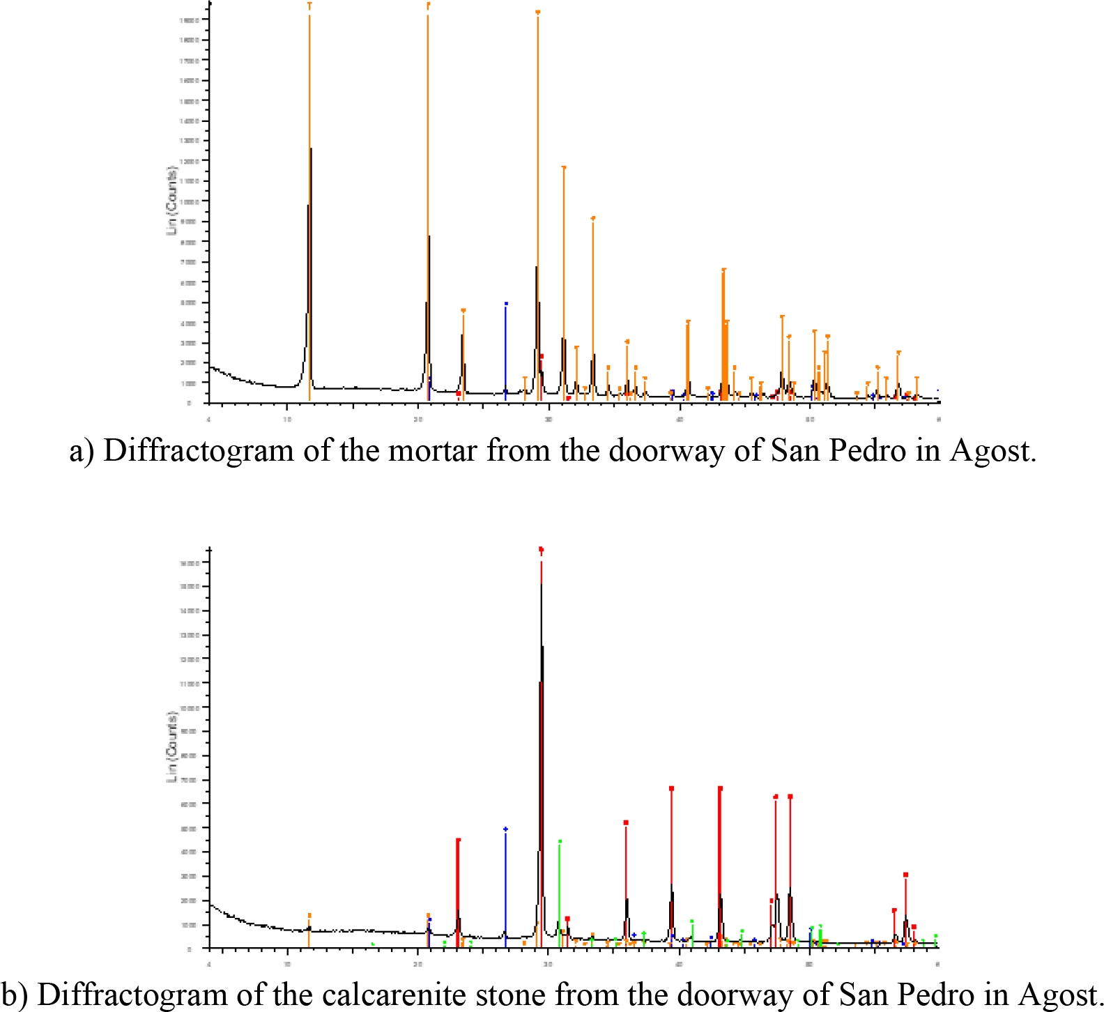 These results indicate a significant presence of calcium sulphate (orange peaks) in existing mortars that are exposed to atmospheric agents (rainwater), and therefore its weakness and deterioration as a hygroscopic material (gains and losses of water in its molecular composition CaSO4.n(H2O)) which makes it not very stable; but also this presence of sulphates can accelerate stone degradation as the stone contains the magnesium of the dolomite and very harmful salts such as magnesium sulphates can be produced (Grossi and Esbert, 1994), (Benavente, 2002, 2021). (Figure 9).
