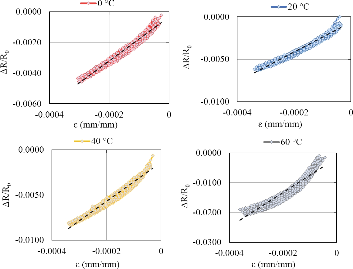 Table 1. Effect of temperature on different electromechanical parameters during strain sensing tests: electrical resistivity, elastic modulus, gauge factor, and Pearson's R2 coefficient of linear regression.