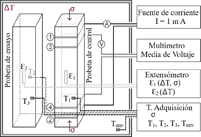 Los electrodos así fijados constituyen las conexiones eléctricas para la aplicación de una corriente eléctrica predefinida entre los puntos exteriores ① y ② al tiempo que se registra la diferencia de potencial medida entre los puntos interiores ③ y ④. La corriente eléctrica fue aplicada mediante una fuente digital Keithley 6220, de National Instruments Inc. La diferencia de potencial se midió con un multímetro digital Keithley 2002, de National Instruments Inc. Las galgas extensométricas de 10 mm (modelo 10/120 CLY41-4L-3M, suministrada por HBM) se utilizaron para registrar las deformaciones producidas tanto por las tensiones como por el incremento de temperatura producido durante el ensayo.