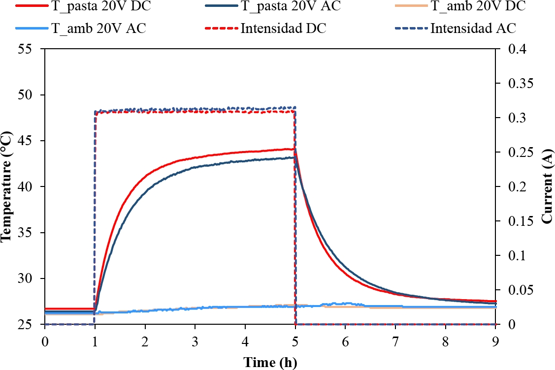 La Figura 5 muestra los resultados obtenidos para la pasta de cemento con 1% NTC y 5% ABG1010 aplicándole una tensión de 20 V AC y DC. Se muestran los valores promedio de temperatura de la muestra para ambos ensayos en ºC y la corriente monitorizada (líneas discontinuas) en amperios (A). En estos ensayos se ha conseguido un incremento de temperatura de +17 °C para ambos tipos de corriente, lo que podría ser una variación suficiente para la aplicación de sistemas de deshielo con temperatura ambiente superior a -15 °C.