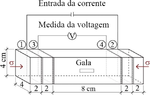 Os eletrodos assim fixados constituem as conexões elétricas para a aplicação de uma corrente elétrica predefinida entre os pontos exteriores ① e ②, ao mesmo tempo em que se registra a diferença de potencial medida entre os pontos interiores ③ e ④. A corrente elétrica foi aplicada por meio de uma fonte digital Keithley 6220, da National Instruments Inc. A diferença de potencial foi medida com um multímetro digital Keithley 2002, da National Instruments Inc. Extensômetros de 10 mm (modelo 10/120 CLY41-4L-3M, fornecidos pela HBM) foram utilizados para registrar as deformações causadas tanto pelas tensões quanto pelo incremento de temperatura durante o ensaio.