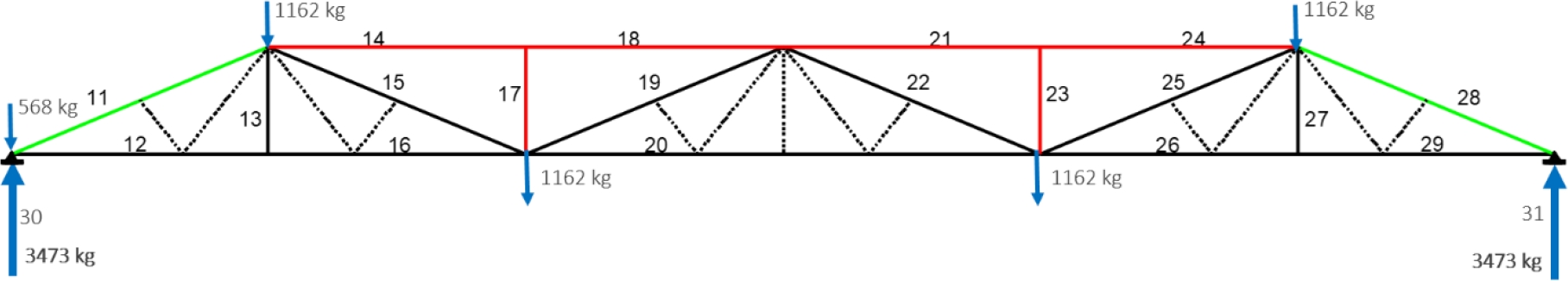 Figure 6. Lattice beam with numbered bars, (nudos), and loads.