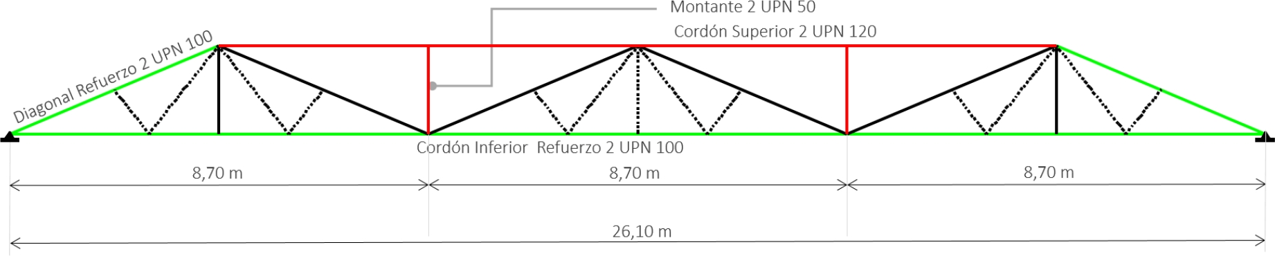 On the other hand, both the inferior cord and some requested existing diagonals were reinforced in order to withstand the internal stresses of traction and compression from the evaluation of the new structural behaviour,