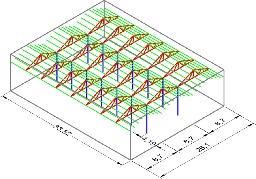 El sistema estructural del planteo original del mercado cubría una superficie de 875 m2 de 26,05 de ancho por 33,50 m de longitud. El plano superior constaba de una serie de tres vigas reticuladas triangulares metálicas de 8,7 m de luz que conformaban 7 ejes separados cada 4,19 m entre sí. Sobre sus nudos, con una distancia de 2,15 m y 2,20 m, se apoyaban una serie de correas de acero que terminaban de configurar la cubierta de tres secciones a dos aguas con terminación final de chapa. Las vigas principales se apoyaban interiormente sobre 14 columnas metálicas y en su perímetro sobre un muro de mampostería de 60 cm de espesor (figura 2 y figura 3).