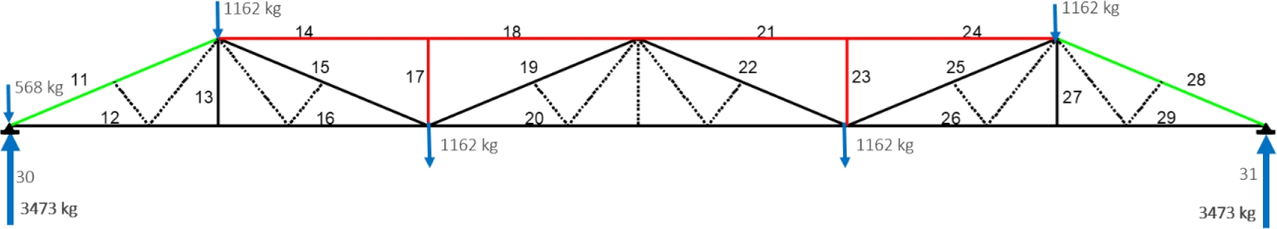 Figura 6. Viga reticulada con numeración de barras, nudos y cargas.
