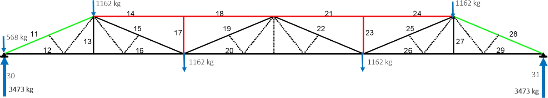 Figura 6. Viga reticulada com numeração de barras, nós e cargas.